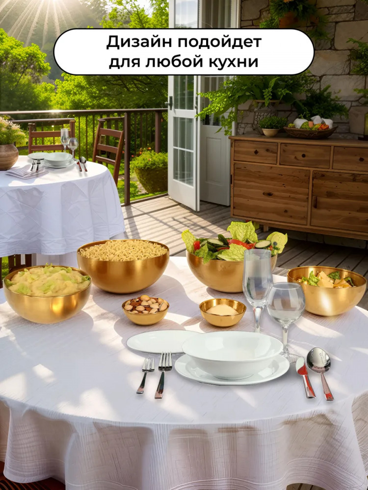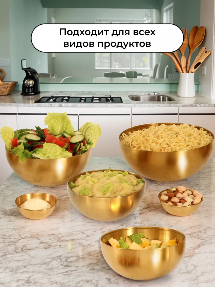 Высококачественный набор из прочной нержавеющей стали — идеальное решение для любой современной кухни. Представленные в элегантном золотом цвете, эти глубокие миски и соусники станут незаменимыми помощниками при приготовлении свежих и вкусных салатов. Изготовленные из устойчивой к коррозии нержавеющей стали, миски отличаются долговечностью и надежностью. Их прочная конструкция обеспечивает сохранность полезных свойств и ароматов и ингредиентов. Благодаря универсальному дизайну, набор гармонично впишется в любой кухонный интерьер, придавая ему завершенный и элегантный вид.