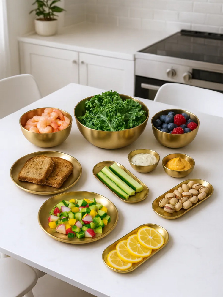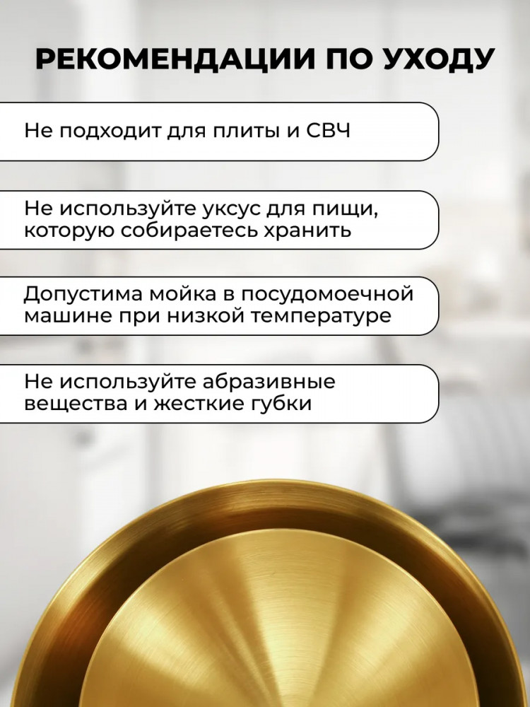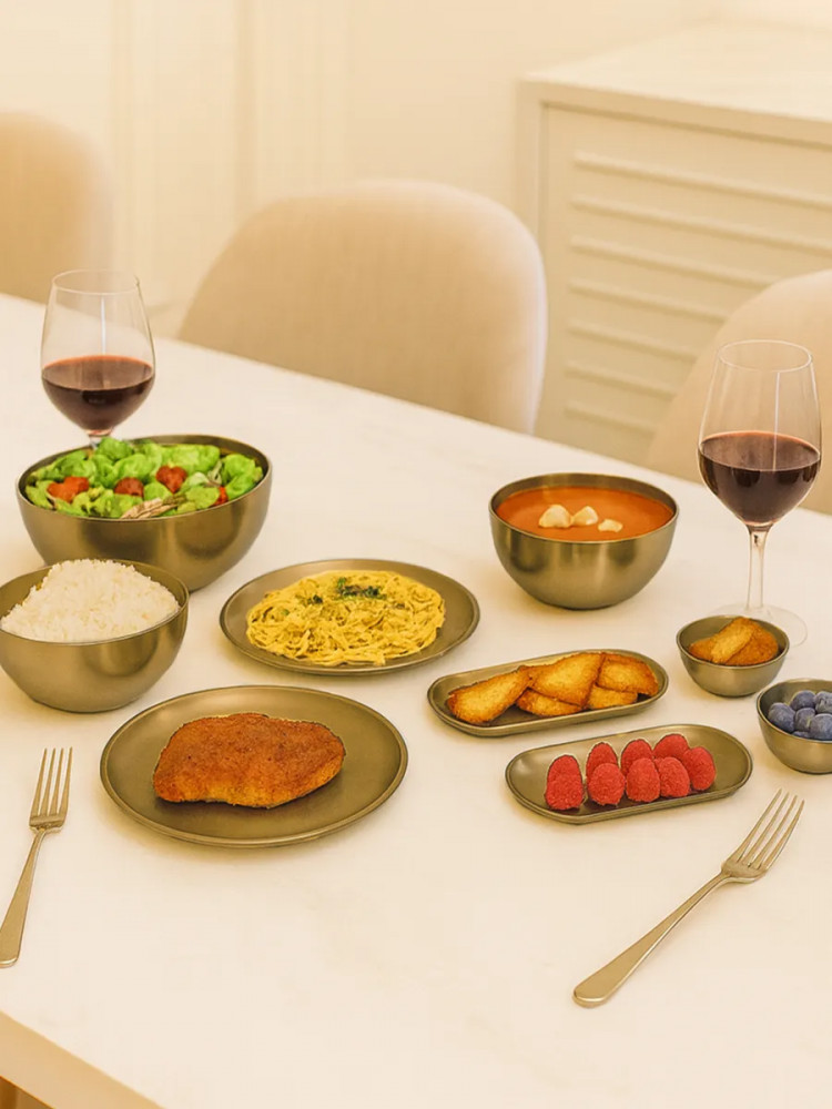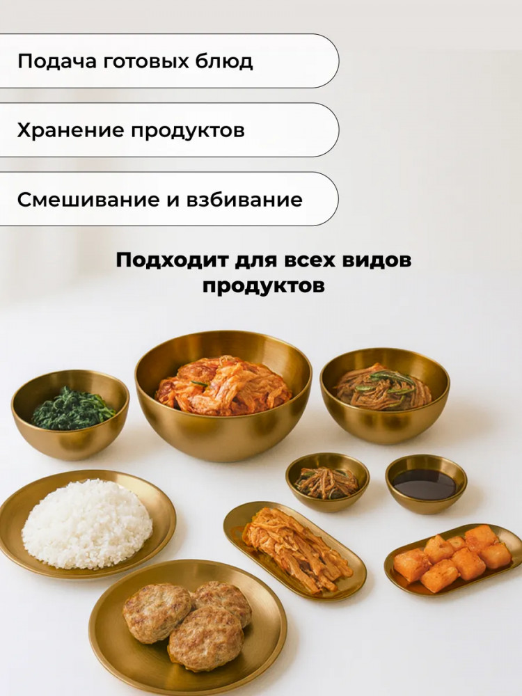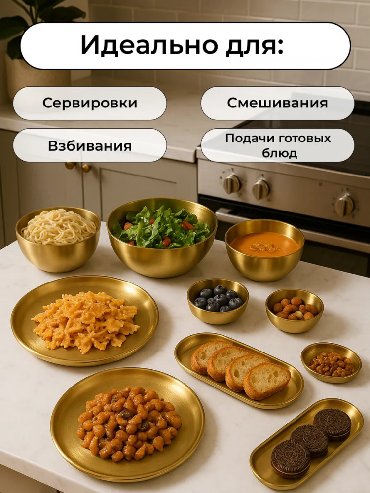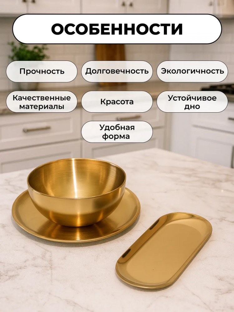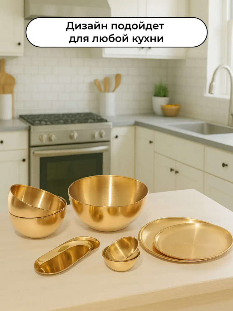 Высококачественный набор из прочной нержавеющей стали — идеальное решение для любой современной кухни. Представленные в элегантном золотом цвете, эти глубокие миски и блюдца станут незаменимыми помощниками при приготовлении свежих и вкусных салатов. Изготовленный из устойчивой к коррозии нержавеющей стали, набор отличается долговечностью и надежностью. Его прочная конструкция обеспечивает сохранность полезных свойств и ароматов и ингредиентов. Благодаря универсальному дизайну, набор гармонично впишется в любой кухонный интерьер, придавая ему завершенный и элегантный вид.