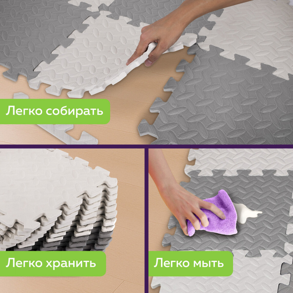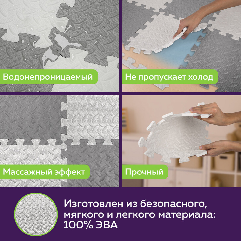 Коврик-пазл изготовлен из безопасного, мягкого и легкого материала — этиленвинилацетата (100% ЭВА). После вскрытия упаковки перед первым использованием рекомендуется промыть элементы коврика-пазла теплой водой с мылом и просушить.