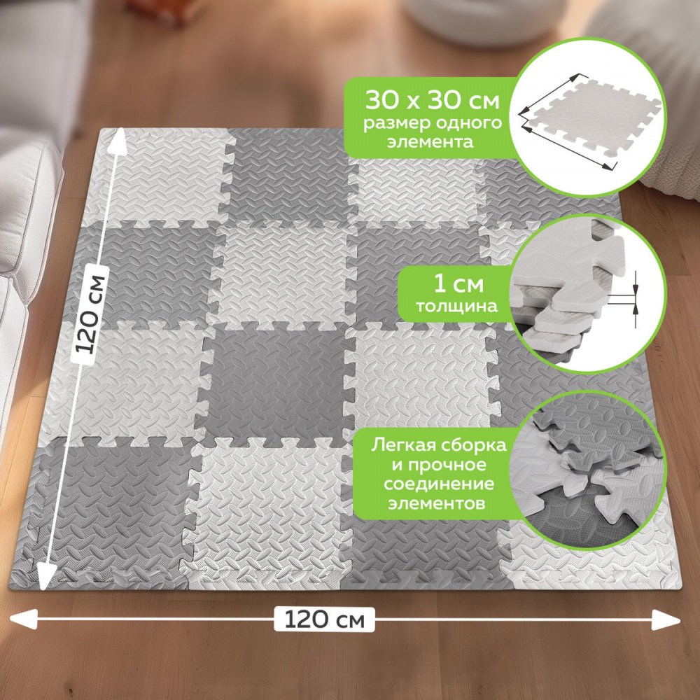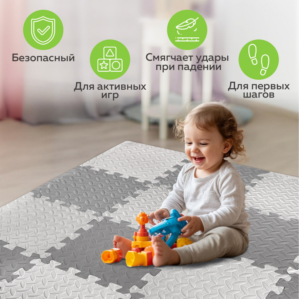 Коврик включает в себя элементы двух оттенков серого цвета. Коврик детский складной легко собирается и разбирается, что позволяет строить различные сооружения, способствуя развитию моторики и пространственного мышления. В то же время коврик детский обеспечивает теплоизоляцию и шумоизоляцию, создавая комфортные условия для игр и ползания.