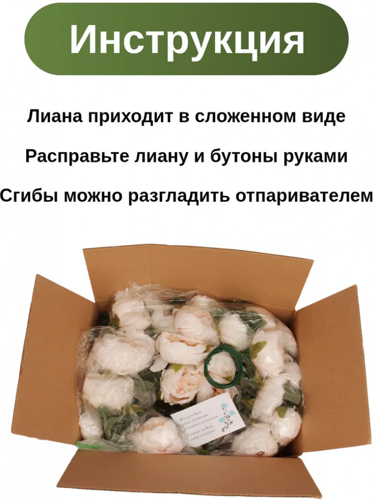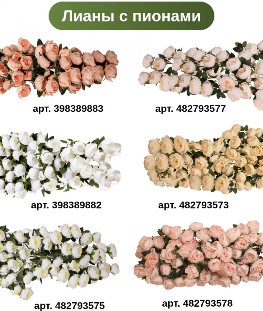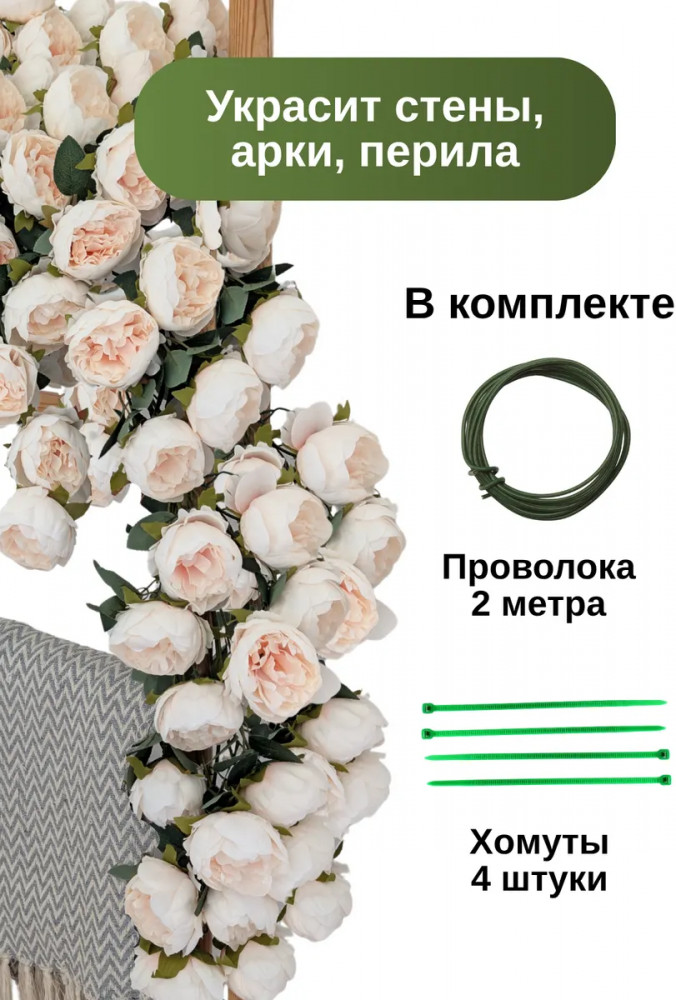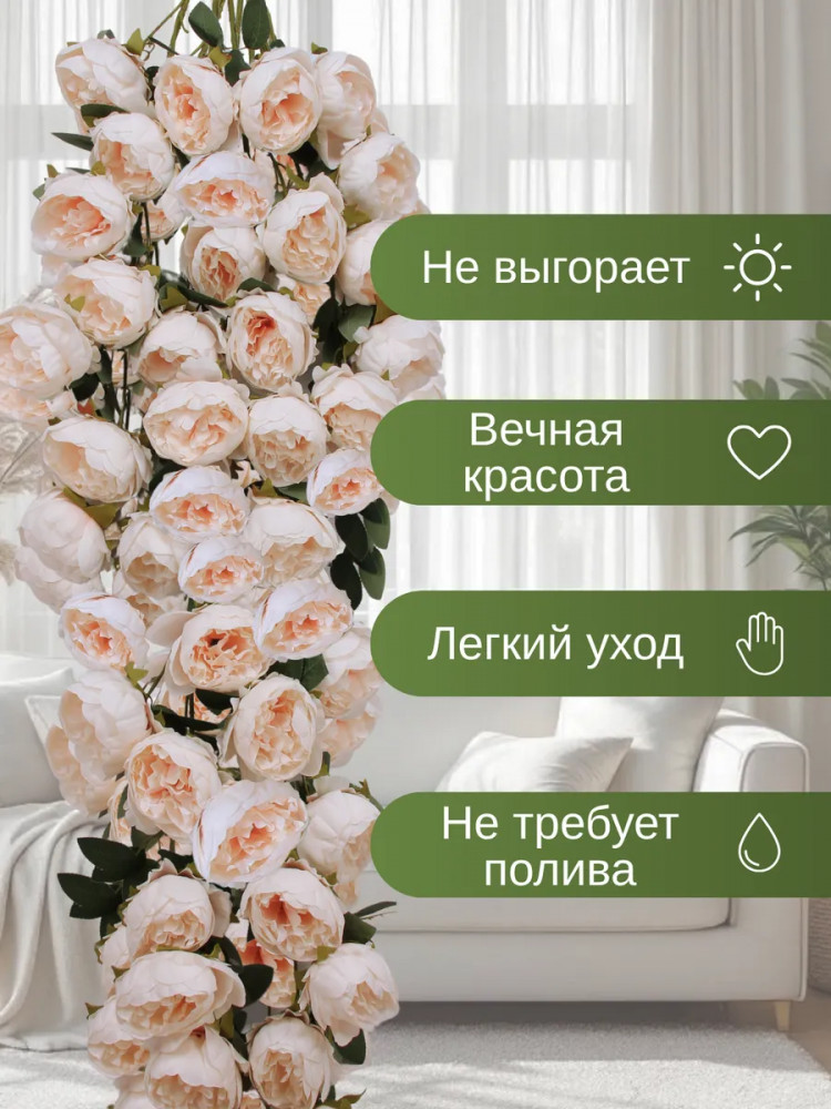 Декоративная лиана с пионами станет эффектным украшением интерьера, праздничных композиций и фотозон. Реалистичные цветы диаметром 10 см создают объёмный и выразительный акцент, а гибкая лиана длиной позволяет легко оформлять стены, арки, перила и мебель. Лианы с цветами легки в уходе, не требуют полива и сохраняют яркость на протяжении долгого времени. Декоративные листья и растения дополняют композицию, создавая ощущение естественности и объема. Искусственные цветы и растения идеально подходят для украшения свадеб, праздников или других мероприятий. Цветочные композиции, арки из цветов и оформление столов приобретают особое очарование благодаря их реалистичности.