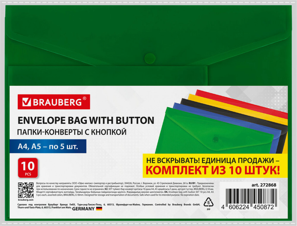 Brauberg Комплект папок-конвертов с кнопкой-20% +17