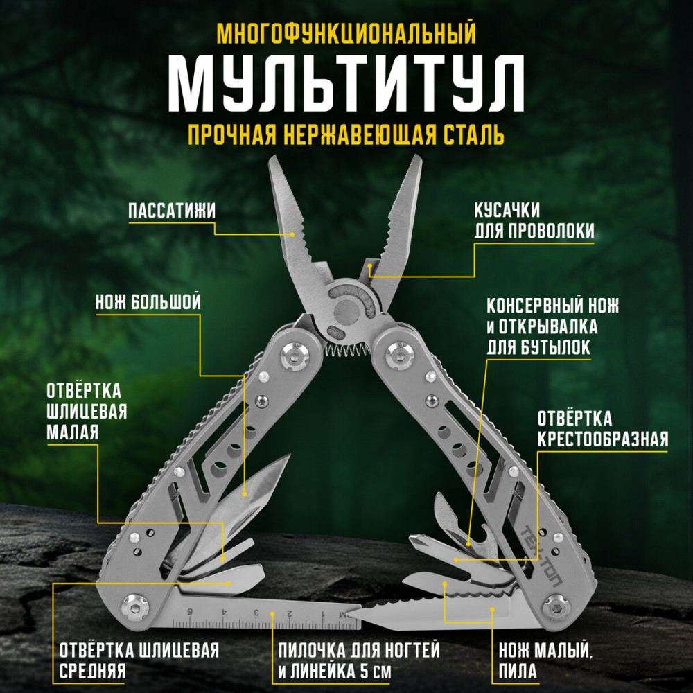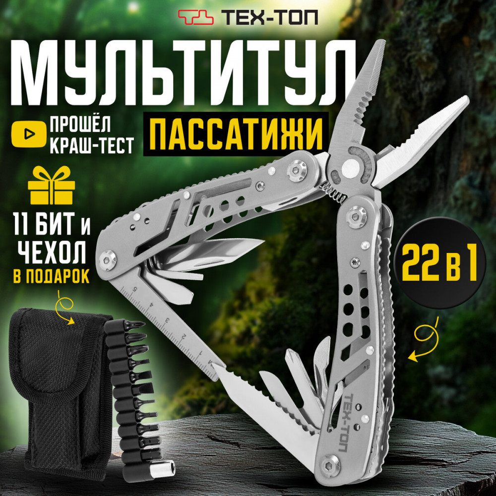 В данный момент этот товар отсутствует в продаже. Возможно, у нас найдется аналогичный или похожий товар здесь. Мультитул ТЕХ-ТОП — это многофункциональный компактный инструмент! Незаменимый помощник в туристических и спортивных походах, вылазках на природу, на охоте и рыбалке. Может использоваться в армейском снаряжении, в быту, строительстве и мелком ремонте.