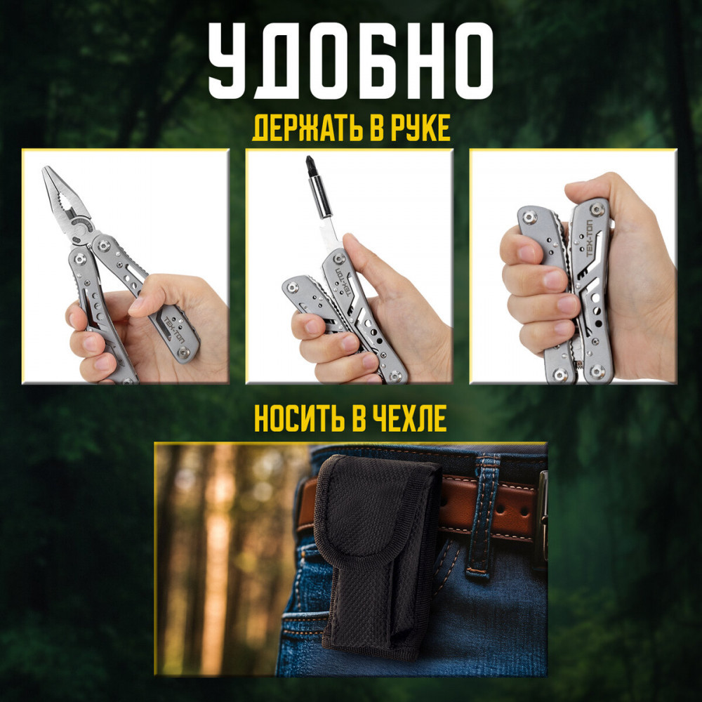 Мультитул — это долговечный и надёжный инструмент, изготовленный из прочной нержавеющей стали. Изделие многофункционально — оно заменяет сразу несколько инструментов, которые чаще всего используются в быту. Складной, компактный мультитул благодаря небольшим габаритам удобно брать с собой в путешествие, а также использовать в качестве тактического армейского прибора для снаряжения СВО.