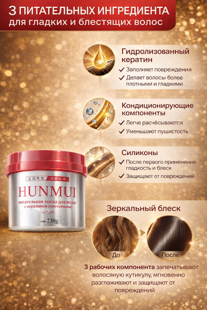 После использования маски волосы становятся гладкими, увлажненными и блестящими. Они легче расчесываются, меньше путаются и выглядят здоровыми. Подходит для всех типов волос, включая сухие и поврежденные.