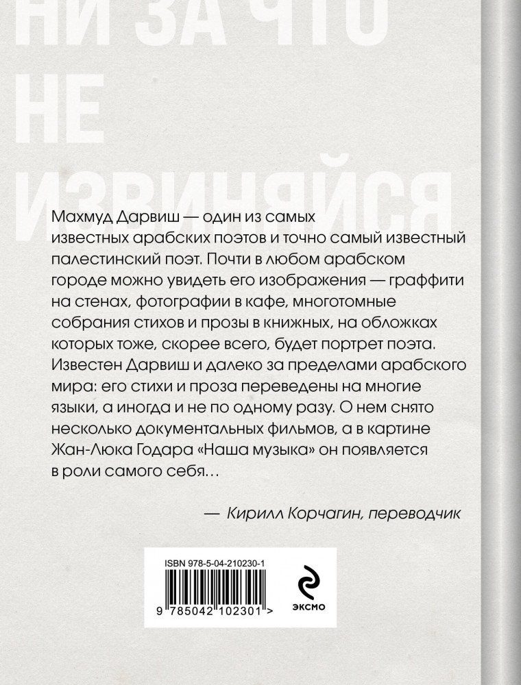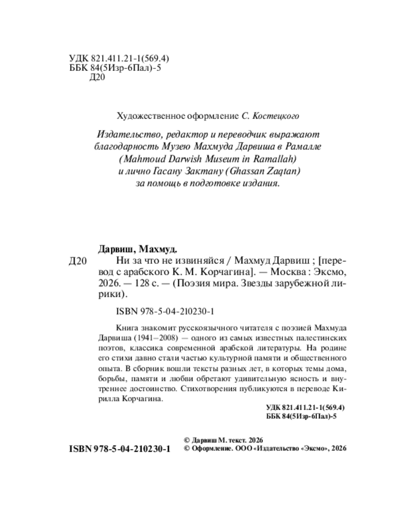 💳 Оплатить за товар можно при получении 🇰🇿 Есть бесплатная доставка по Казахстану от 1 дня 🎁 Копите бонусы с каждой покупки Серия: Поэзия мира. Звезды зарубежной лирики Книга знакомит русскоязычного читателя с поэзией Махмуда Дарвиша (1941–2008) — одного из самых известных палестинских поэтов, классика современной арабской литературы. На родине его стихи давно стали частью культурной памяти и общественного опыта. В сборник вошли тексты разных лет, в которых темы дома, борьбы, памяти и любви обретают удивительную ясность и внутреннее достоинство. Стихотворения публикуются в переводе Кирилла Корчагина. |