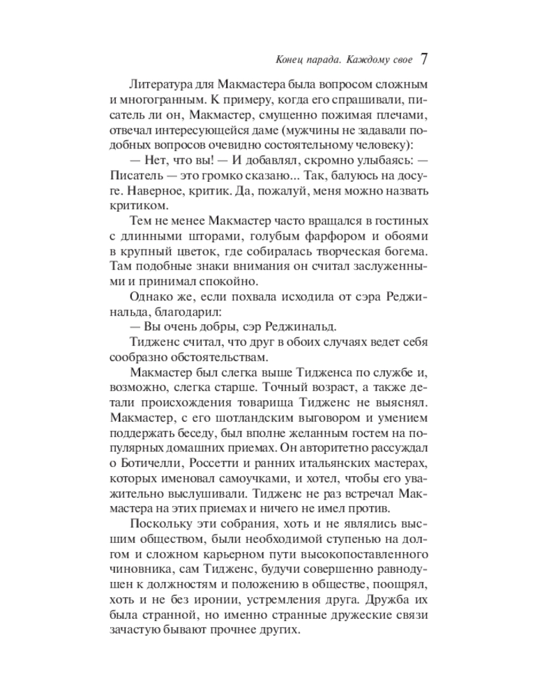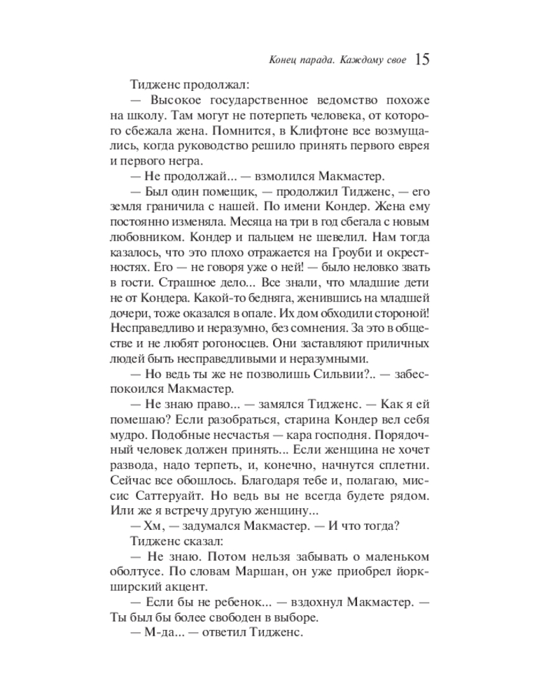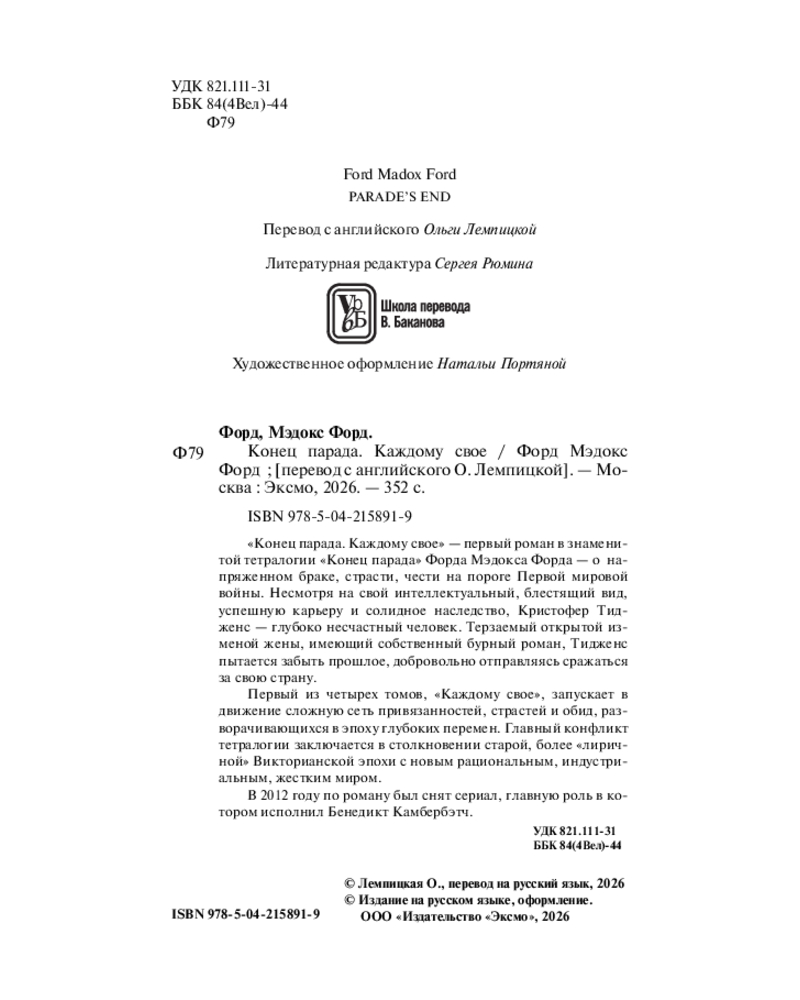 💳 Оплатить за товар можно при получении 🇰🇿 Есть бесплатная доставка по Казахстану от 1 дня 🎁 Копите бонусы с каждой покупки Серия: Магистраль. Сага «Конец парада. Каждому своё» — первый роман в знаменитой тетралогии «Конец парада» Форда Мэдокса Форда — о напряженном браке, страсти, чести на пороге Первой мировой войны. Несмотря на свой интеллектуальный, блестящий вид, успешную карьеру и солидное наследство, Кристофер Тидженс — глубоко несчастный человек. Терзаемый открытой изменой жены, имеющий собственный бурный роман, Тидженс пытается забыть прошлое, добровольно отправляясь сражаться за свою страну. |