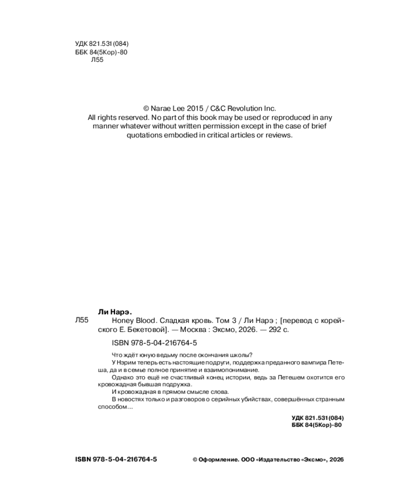 💳 Оплатить за товар можно при получении 🇰🇿 Есть бесплатная доставка по Казахстану от 1 дня 🎁 Копите бонусы с каждой покупки Серия: Комильфо. Вебтуны. Романтика и школа Что ждет юную ведьму после окончания школы? У Нэрим теперь есть настоящие подруги, поддержка преданного вампира Петеша, да и в семье полное принятие и взаимопонимание. Однако это еще не счастливый конец истории, ведь за Петешем охотится его кровожадная бывшая подружка. И кровожадная в прямом смысле слова. В новостях только и разговоров о серийных убийствах, совершенных странным способом... |