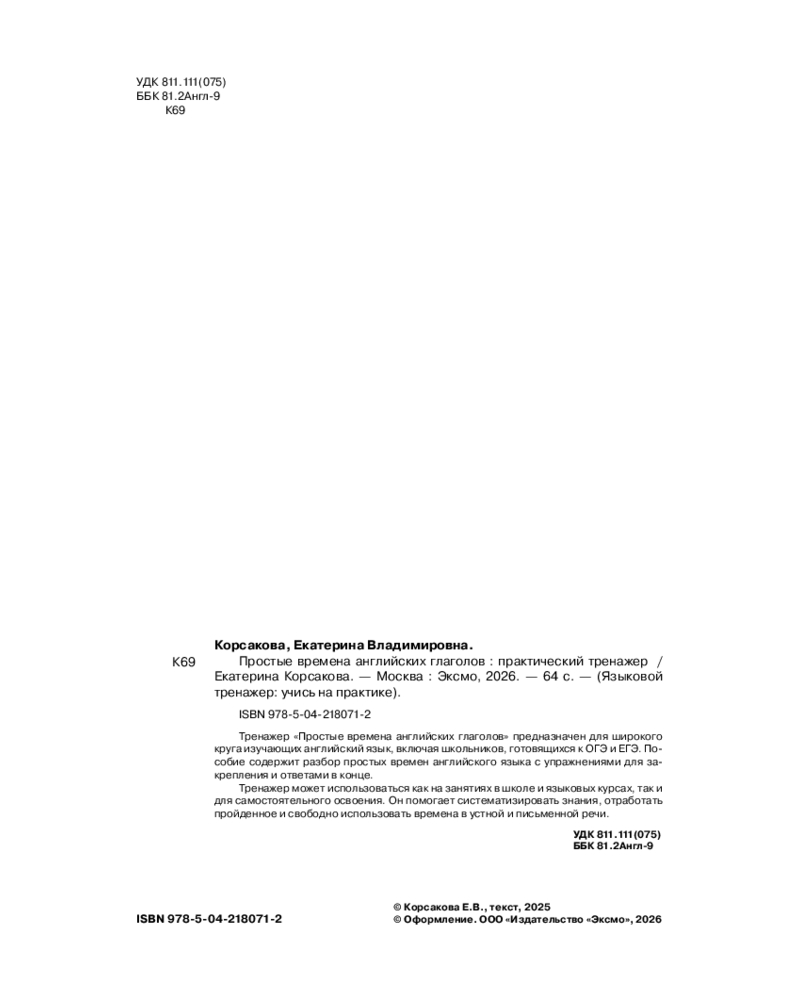 💳 Оплатить за товар можно при получении 🇰🇿 Есть бесплатная доставка по Казахстану от 1 дня 🎁 Копите бонусы с каждой покупки Серия: Языковой тренажер: учись на практике «Простые времена английских глаголов» — практический тренажер, который поможет вам уверенно овладеть одной из самых сложных, но необходимых тем английского языка. Вас ждет разбор простых времен английского языка с упражнениями для закрепления и ответами в конце. |