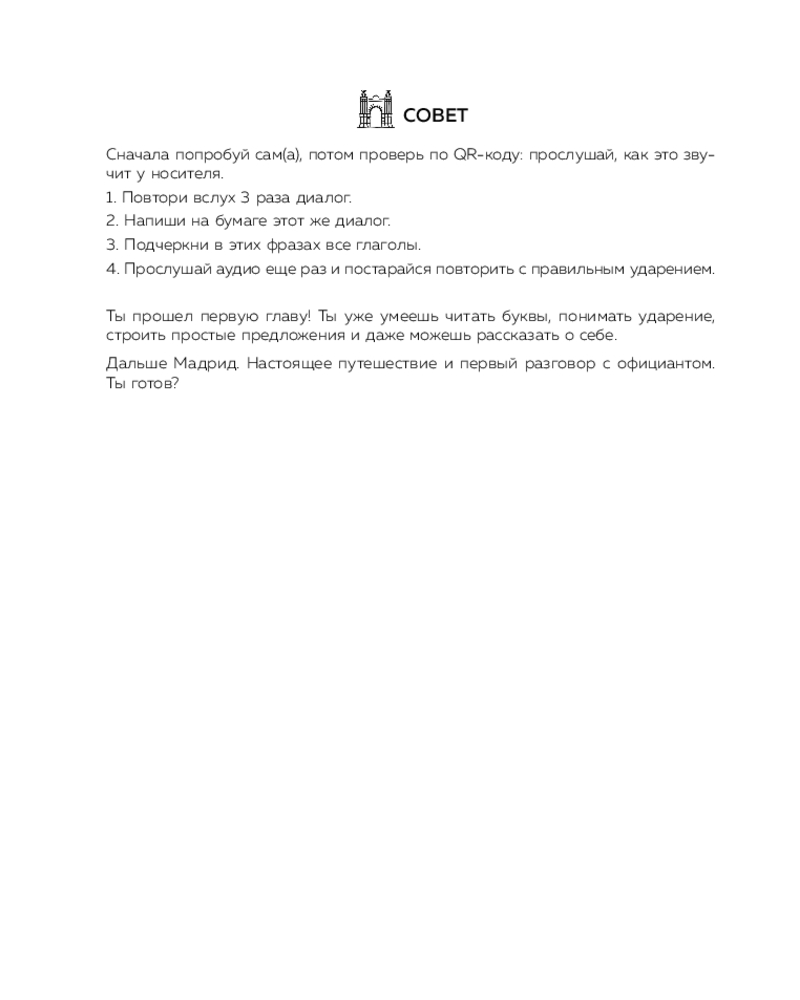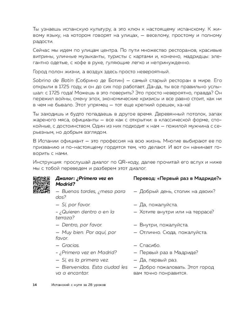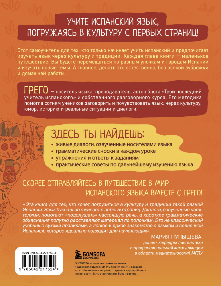 💳 Оплатить за товар можно при получении 🇰🇿 Есть бесплатная доставка по Казахстану от 1 дня 🎁 Копите бонусы с каждой покупки Серия: Иностранный с носителем: учим естественно, говорим свободно «Испанский за 28 уроков» — естественный старт через погружение в культуру! Каждая глава — маленькое путешествие по городам Испании с простой грамматикой, полезной лексикой и аудио от носителей языка. Обучение проходит через живые диалоги, реальные ситуации, исторический и культурный контекст — без перегрузки и зубрежки. |