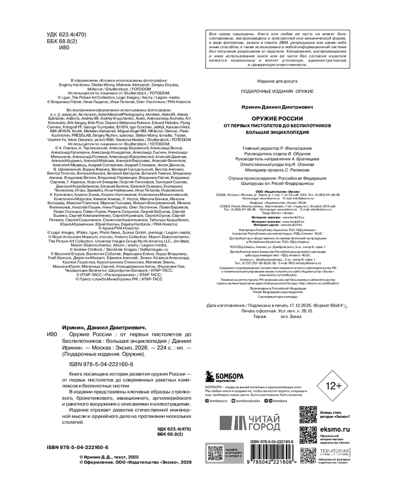 💳 Оплатить за товар можно при получении 🇰🇿 Есть бесплатная доставка по Казахстану от 1 дня 🎁 Копите бонусы с каждой покупки Серия: Подарочные издания. Оружие От первых пистолетов до современных ракетных комплексов и кораблей — это история силы и мастерства, воли, воплощенная в человеческих идеях и металле. С этой книгой вы пройдете через века инженерных открытий и подвигов и узнаете, как создавалось и модифицировалось оружие России на протяжении столетий — от пистолета Токарева и автомата Калашникова до современных ПЗРК «Верба», дронов и стратегических комплексов «Ярс». |