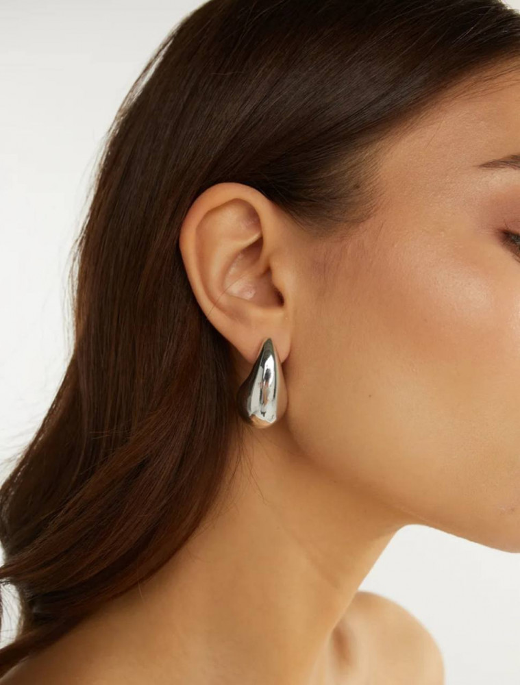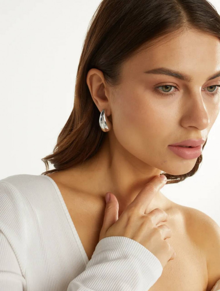 Эти объемные серьги в форме капли — воплощение современного стиля и элегантности. Их гладкая, полированная поверхность имитирует перетекающее жидкое серебро, создавая эффектный и притягивающий внимание акцент. Серьги выполнены в виде пусет (гвоздиков), что обеспечивает комфортную посадку и надежную фиксацию, при этом они достаточно легкие для повседневного ношения, несмотря на массивный вид. Идеально подходят для создания актуального образа в стиле «old money» или как выразительное дополнение к минималистичному наряду.