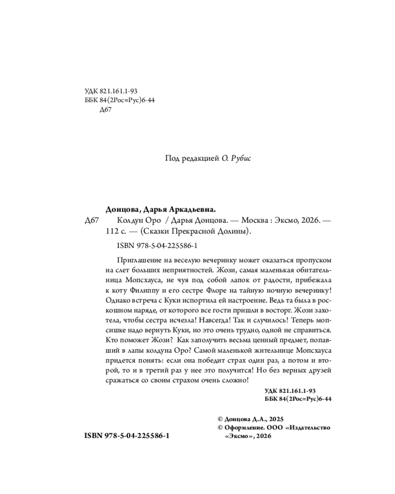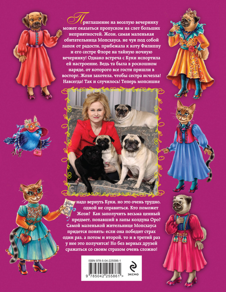 💳 Оплатить за товар можно при получении 🇰🇿 Есть бесплатная доставка по Казахстану от 1 дня 🎁 Копите бонусы с каждой покупки Серия: Сказки Прекрасной Долины Приглашение на весёлую вечеринку может оказаться пропуском на слёт больших неприятностей. Жози, самая маленькая обитательница Мопсхауса, не чуя под собой лапок от радости, прибежала к коту Филиппу и его сестре Флоре на тайную ночную вечеринку! Однако встреча с Куки испортила ей настроение. Ведь та была в роскошном наряде, от которого все гости пришли в восторг. Жози захотела, чтобы сестра исчезла! Навсегда! Так и случилось! Теперь мопсишке надо вернуть Куки, но это очень трудно, одной не справиться. Кто поможет Жози? Как заполучить весьма ценный предмет, попавший в лапы колдуна Оро? Самой маленькой жительнице Мопсхауса придётся понять: если она победит страх один раз, а потом и второй, то и в третий раз у неё это получится! Но без верных друзей сражаться со своим страхом очень сложно! |