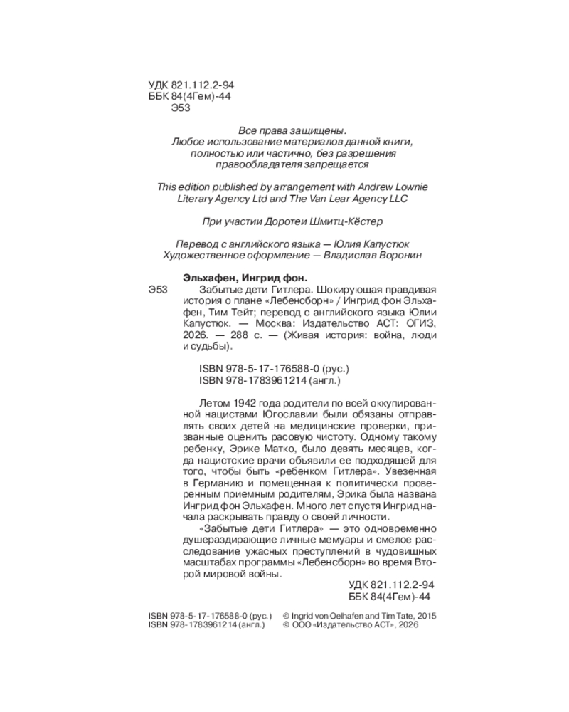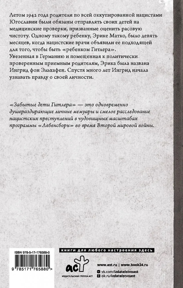 💳 Оплатить за товар можно при получении 🇰🇿 Есть бесплатная доставка по Казахстану от 1 дня 🎁 Копите бонусы с каждой покупки Серия: Живая история: война, люди и судьбы Летом 1942 года родители по всей оккупированной нацистами Югославии были обязаны отправлять своих детей на медицинские проверки, призванные оценить расовую чистоту. Одному такому ребенку, Эрике Матко, было девять месяцев, когда нацистские врачи объявили ее подходящей для того, чтобы быть «ребенком Гитлера». Увезенная в Германию и помещенная к политически проверенным приемным родителям, Эрика была названа Ингрид фон Эльхафен. Спустя много лет Ингрид начала узнавать правду о своей личности. |