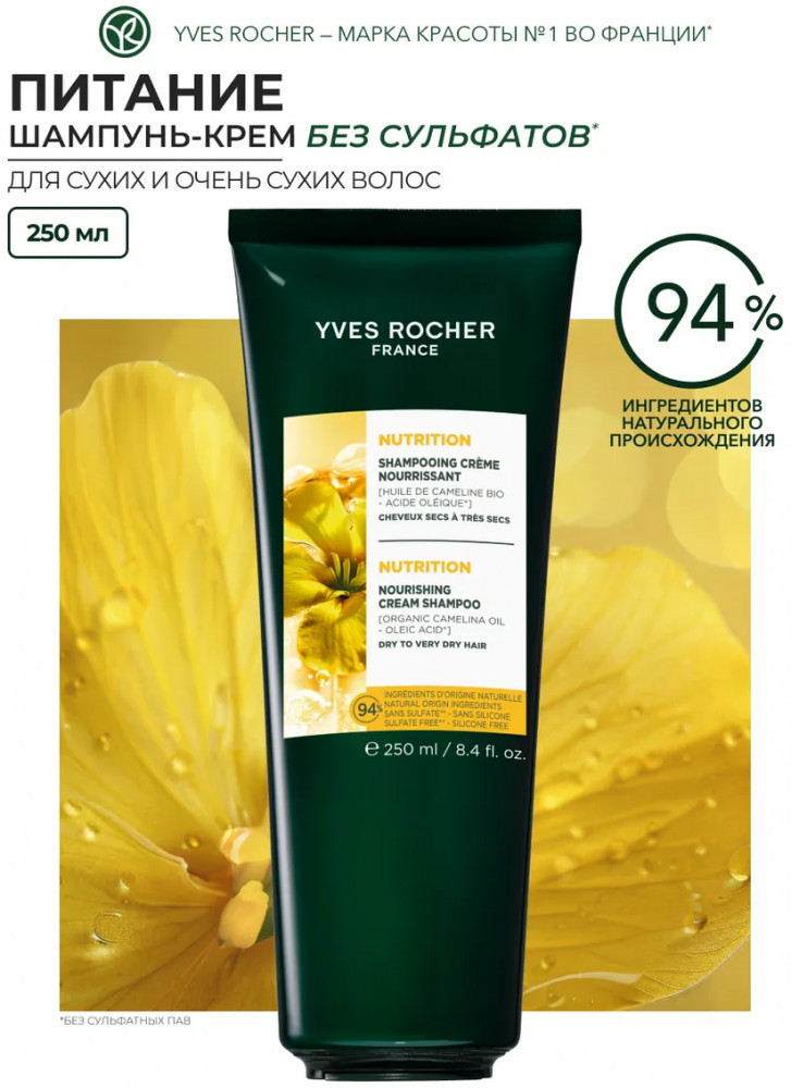 Yves Rocher Шампунь-крем для сухих и очень сухих волос с маслом рыжика посевного «Питание. Nutrition»+75