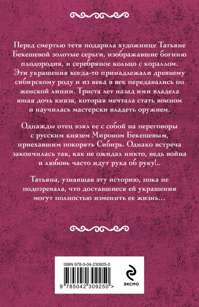 💳 Оплатить за товар можно при получении 🇰🇿 Есть бесплатная доставка по Казахстану от 1 дня 🎁 Копите бонусы с каждой покупки Серия: Любовь, интрига, тайна. Новое оформление (обложка) Перед смертью тетя подарила художнице Татьяне Бекешевой золотые серьги, изображавшие богиню плодородия, и серебряное кольцо с кораллом. Эти украшения когда-то принадлежали древнему сибирскому роду и из века в век передавались по женской линии. Триста лет назад ими владела юная дочь князя, которая мечтала стать воином и научилась мастерски владеть оружием. Однажды отец взял ее с собой на переговоры с русским князем Мироном Бекешевым, приехавшим покорять Сибирь. Однако встреча закончилась так, как не ожидал никто, ведь война и любовь часто идут рука об руку!.. Татьяна, узнавшая эту историю, пока не подозревала, что доставшиеся ей украшения могут полностью изменить ее жизнь... |