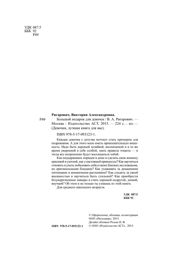 Большой подарок для девочекШлопак Татьяна Геннадьевна, Виктория Александровна Ригарович В данный момент этот товар отсутствует в продаже. Возможно, у нас найдется аналогичный или похожий товар здесь. Серия: Девочки, для вас Каждая девочка мечтает стать совершенством в глазах окружающих, а это значит — надо учиться искусству быть самой привлекательной и обаятельной, самой умной, доброй, нежной. Что для этого нужно? Как научиться следить за своей внешностью, контролировать вес, поддерживать здоровье и сохранять хорошую физическую форму? Как жить в мире с окружающими — взрослыми и сверстниками, приобрести много верных и хороших друзей? Как стать хорошей помощницей Е доме, радовать кулинарными шедеврами, ухаживать за растениями? Как разобраться в гороскопах и проникнуть в тайны имен? Всему этому вас научит и многое еще подскажет эта книга. |