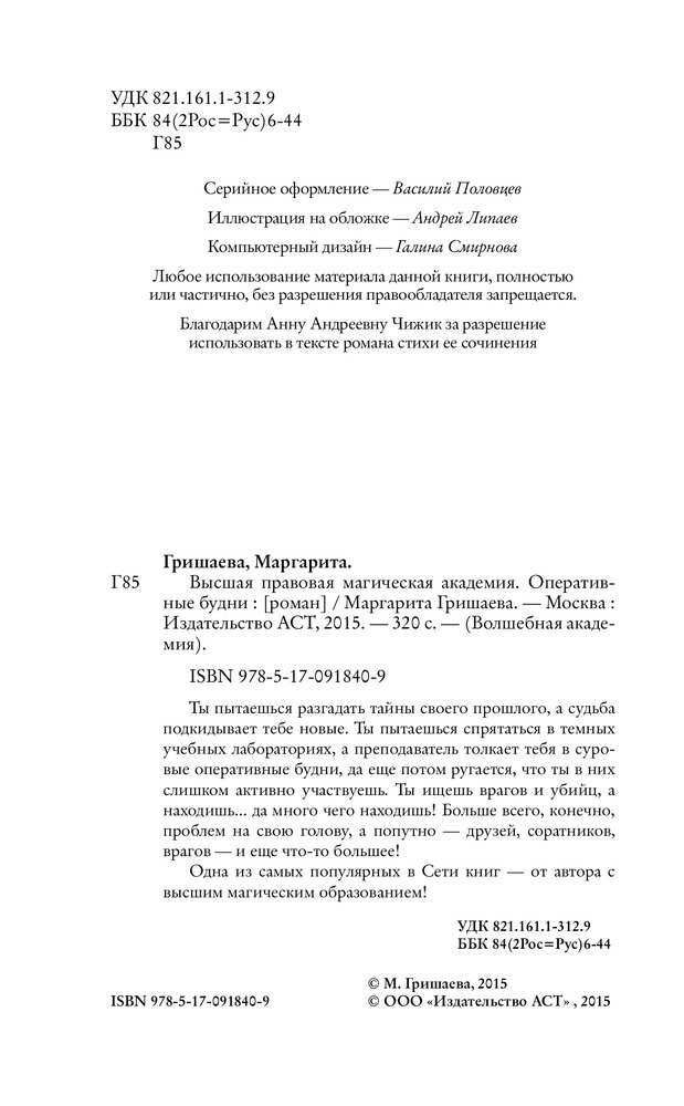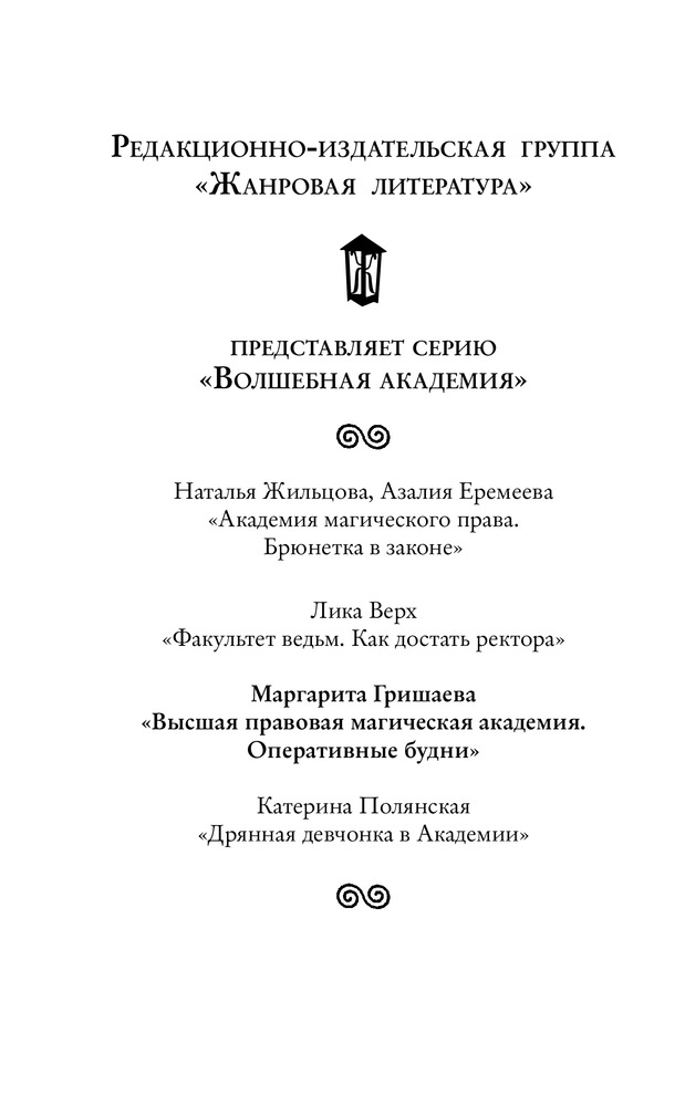 Высшая правовая магическая академия. Оперативные будниВ данный момент этот товар отсутствует в продаже. Возможно, у нас найдется аналогичный или похожий товар здесь. Серия: Волшебная академия Ты пытаешься разгадать тайны своего прошлого, а судьба подкидывает тебе новые. Ты пытаешься спрятаться в темных учебных лабораториях, а преподаватель толкает тебя в суровые оперативные будни, да еще потом ругается, что ты в них слишком активно участвуешь. Ты ищешь врагов и убийц, а находишь… да много чего находишь! Больше всего, конечно, проблем на свою голову, а попутно — друзей, соратников, врагов — и еще |