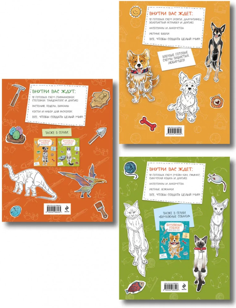 Бумажные котики. Бумажные собаки. Бумажные динозавры. Комплект из 3 книг-20% +114