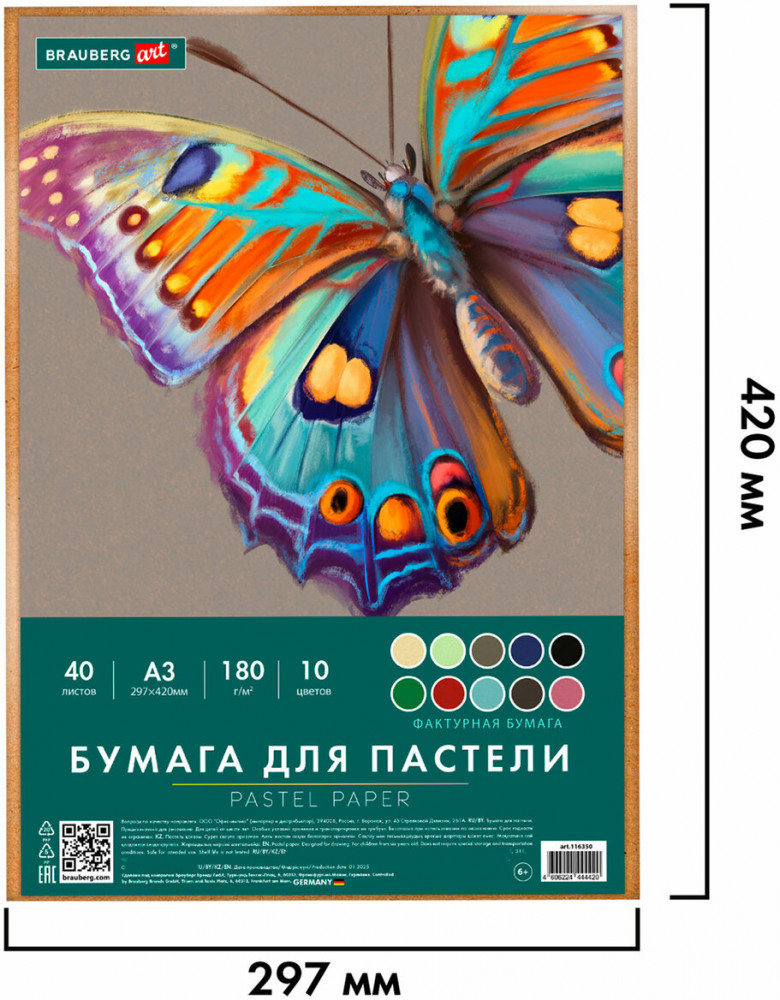 Brauberg Набор бумаги для пастелиВ данный момент этот товар отсутствует в продаже. Возможно, у нас найдется аналогичный или похожий товар здесь. Бумага для пастели Brauberg предназначена для различных техник рисования. Позволяет создавать мягкие и детализированные текстуры на картинах, а при более плотной зарисовке пастель выглядит ярко и сочно. Окрашенная в массе бумага в 10 популярных цветах плотностью 180 г/м2 гарантирует превосходное сохранение работ. Еще одним преимуществом является наличие рельефной фактуры, что немаловажно для создания рисунка пастелью. Упаковка сделана из микрогофрокартона, что позволит сохранить ваши рисунки во время хранения и транспортировки. В ней также удобно хранить готовые работы. Внутренний блок содержит 40 листов формата А3 (297×420 мм). Бумага для пастели Brauberg незаменима как для начинающих художников, так и для профессионалов. Приобретайте товары для творчества и создавайте неповторимые работы! |