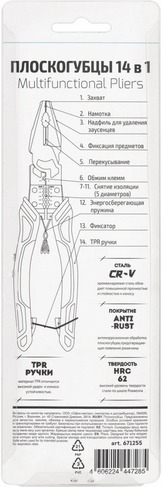 Многофункциональные плоскогубцы Гс — это надежный инструмент, необходимый каждому мастеру. Подходят как для профессионального монтажа, так и для бытовых задач. Плоскогубцы изготовлены из профессиональной хромванадиевой стали CR-V, обладающей повышенной износостойкостью и прочностью. Твердость стали — 62 HRC по шкале Роквелла. Специальное покрытие ANTI-RUST защищает металл от коррозии. Эргономичные рукоятки из термопластичной резины обеспечивают удобный захват и предотвращают скольжение. Упакованы в прозрачный блистер с европодвесом.