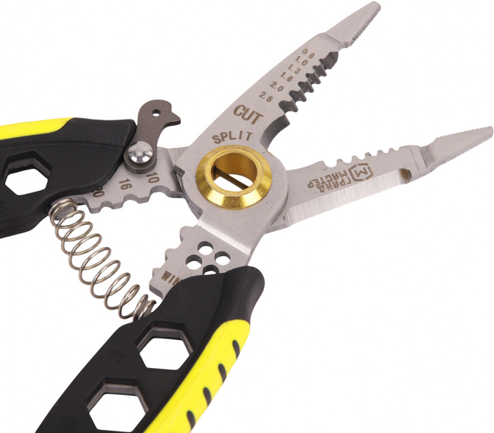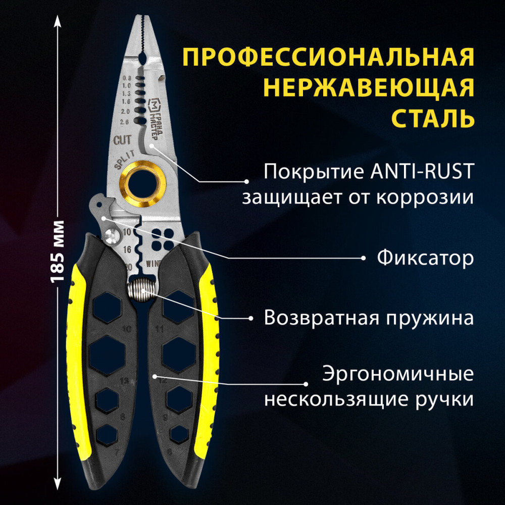 Многофункциональные плоскогубцы ГРАНДМАСТЕР — это надежный инструмент, необходимый каждому мастеру. Подходят как для профессионального монтажа, так и для бытовых задач. Плоскогубцы изготовлены из профессиональной нержавеющей стали AISI420, обладающей повышенной устойчивостью к коррозии. Твердость стали — 55 HRC по шкале Роквелла. Специальное покрытие ANTI-RUST обеспечивает дополнительную защиту от коррозии. Эргономичные рукоятки из термопластичной резины обеспечивают удобный захват и предотвращают скольжение.