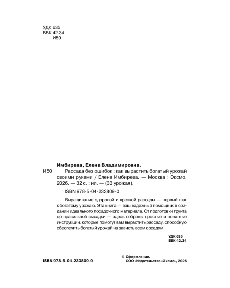 💳 Оплатить за товар можно при получении 🇰🇿 Есть бесплатная доставка по Казахстану от 1 дня 🎁 Копите бонусы с каждой покупки Серия: 33 урожая (2026) Выращивание рассады — это ключ к богатому урожаю и здоровым растениям. Но как часто трудности на этом этапе портят все планы: семена не всходят, саженцы вытягиваются, а болезни уничтожают результаты ваших усилий? Эта книга станет вашим незаменимым помощником! Елена Имбирева собрала в ней все необходимые советы и практические рекомендации, чтобы вы смогли вырастить крепкую и здоровую рассаду без лишних хлопот. |