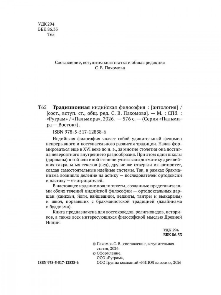 💳 Оплатить за товар можно при получении 🇰🇿 Есть бесплатная доставка по Казахстану от 1 дня 🎁 Копите бонусы с каждой покупки Серия: Пальмира — восток Индийская философия являет собой удивительный феномен непрерывного и поступательного развития традиции. Начав формироваться еще в XVI веке до н. э., за многие столетия она достигла невероятного внутреннего разнообразия. При этом одни школы (даршаны) в той или иной степени учитывали догматику древнейших сакральных текстов (вед), другие же отвергли их авторитет, создав самостоятельные идейные системы. Так, в рамках брахманизма возникло деление на астику — последователей ортодоксии и настику — ее отрицателей. В настоящее издание вошли тексты, созданные представителями обоих течений индийской философии — ортодоксальных даршан (санкхьи, йоги, вайшешики, веданты, тантры и вьякараны) и школ, порвавших с брахманистской традицией (джайнизма и буддизма). Книга предназначена для востоковедов, религиоведов, историков, а также всех интересующихся философской мыслью Древней Индии. |
