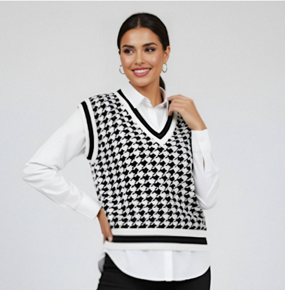Этот вязаный жилет с узором «гусиная лапка» — идеальный баланс между вечной классикой и современным стилем преппи. Он создан для тех, кто ценит комфорт, но не готов жертвовать элегантностью. Вязаный жилет с культовым принтом «гусиная лапка» станет той самой базой, которая «собирает» любой образ — от строгого офисного дресс-кода до расслабленного casual.