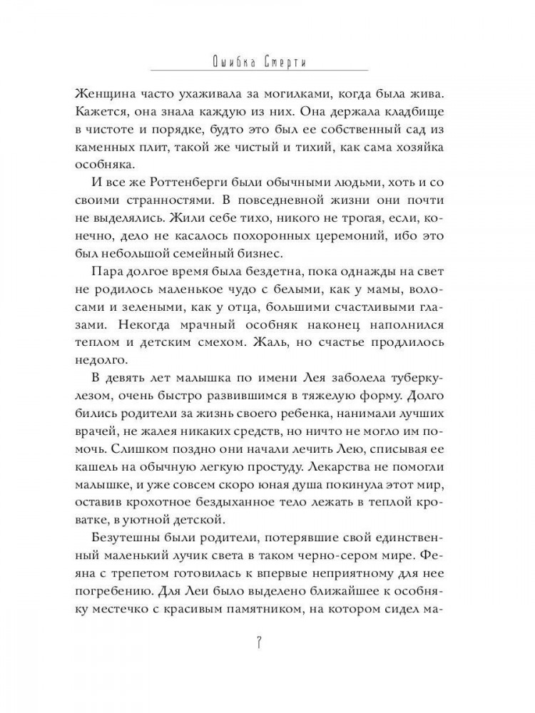 💳 Оплатить за товар можно при получении 🇰🇿 Есть бесплатная доставка по Казахстану от 1 дня 🎁 Копите бонусы с каждой покупки Роман «Ошибка Смерти» — это мрачное, но парадоксально жизнеутверждающее городское фэнтези. Девятилетняя Лея умирает от туберкулеза, но не отправляется в мир иной, а остается в своем доме. Этот недочет обнаруживает Смерть. Вместо того чтобы забрать ее душу, она заключает с Леей сделку — теперь девочка станет преемницей старухи с косой и ее самой большой ошибкой. |