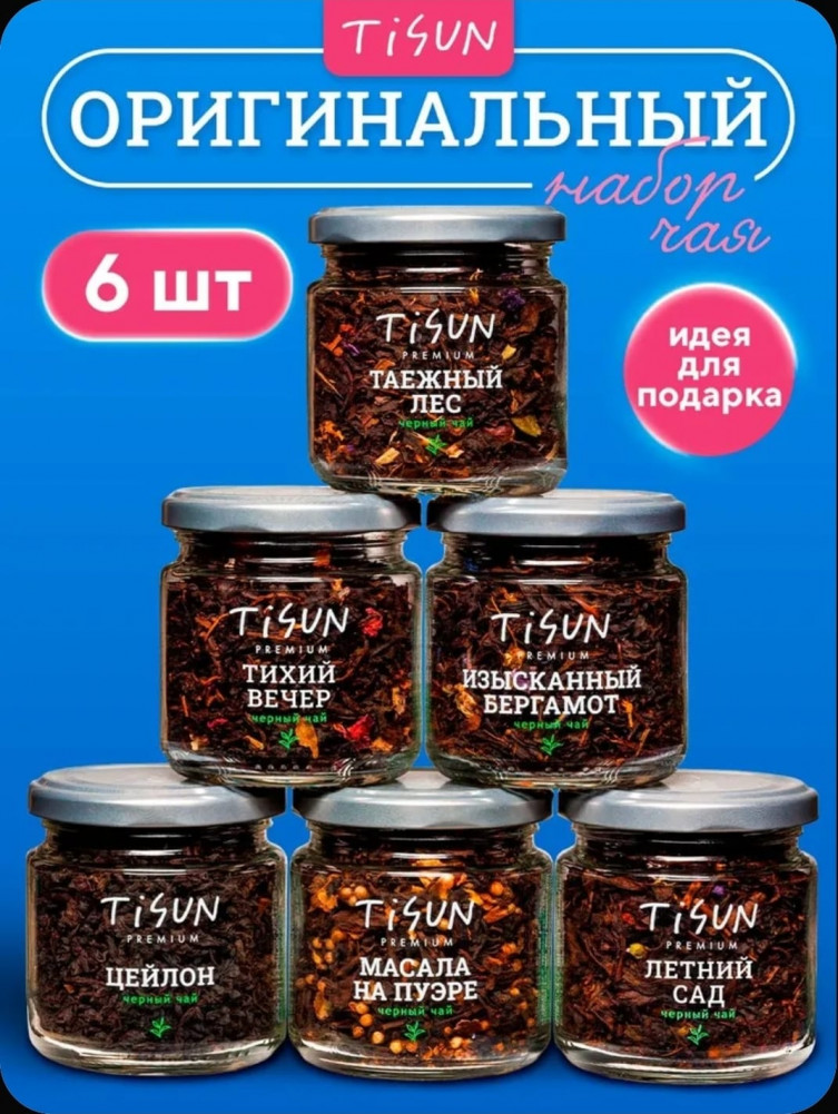 Комплект включает в себя ассорти из 6 видов листового черного чая:
