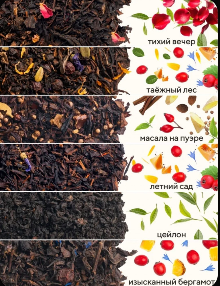 • «Тихий вечер» — черный чай, бодрящий ароматный чай с лепестками красной розы. Насыщенный напиток янтарного цвета с тонкими цветочными нотками. Состав: черный чай, лепестки красной розы, ароматизатор. Вкус: невероятный букет вкусов, с приятным ягодным послевкусием.