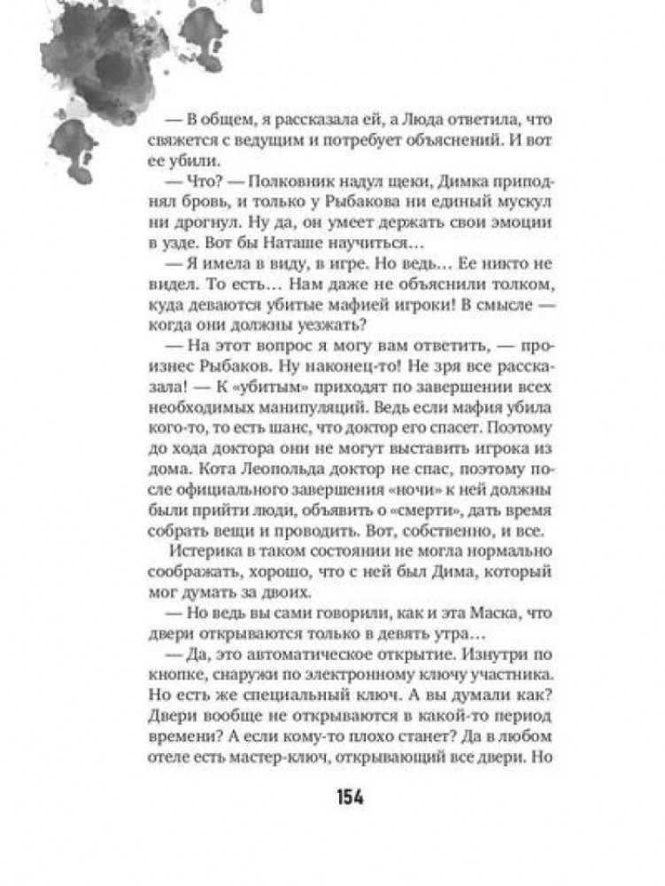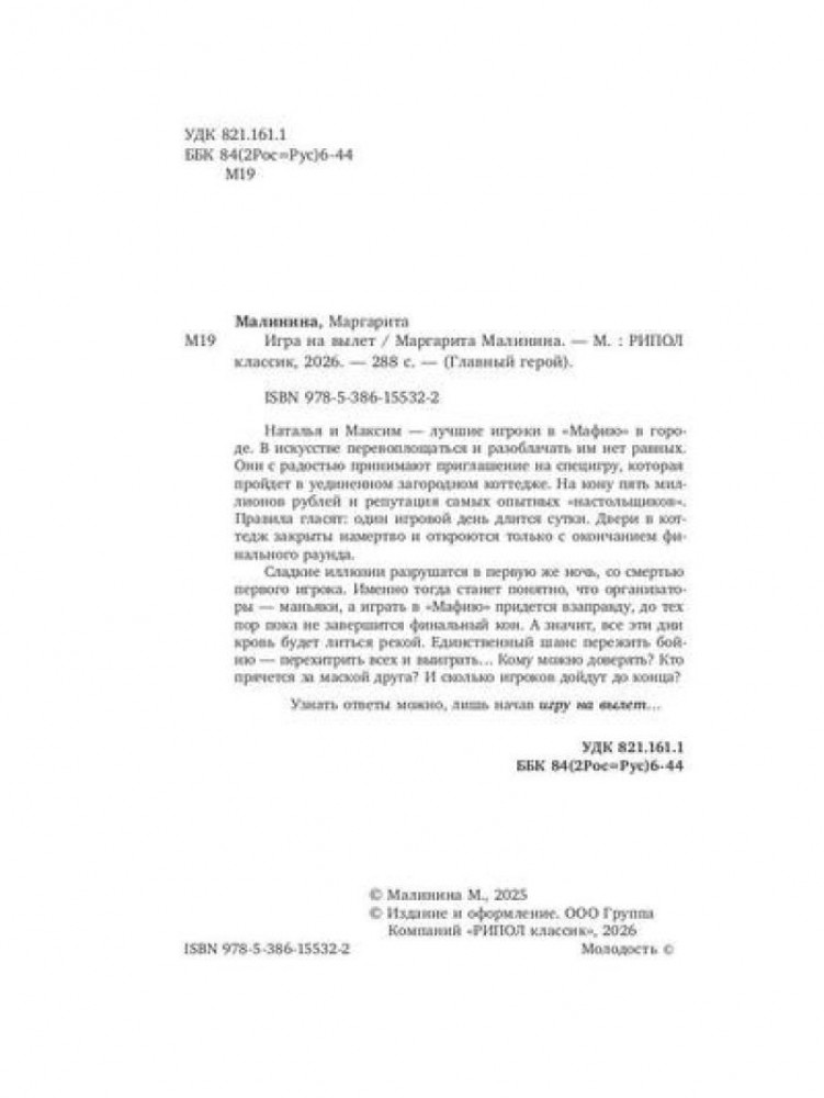 💳 Оплатить за товар можно при получении 🇰🇿 Есть бесплатная доставка по Казахстану от 1 дня 🎁 Копите бонусы с каждой покупки Серия: Главный герой Наталья и Максим — лучшие игроки в «Мафию» в городе. В искусстве перевоплощаться и разоблачать им нет равных. Они с радостью принимают приглашение на специгру, которая пройдет в уединенном загородном коттедже. На кону пять миллионов рублей и репутация самых опытных «настольщиков». Правила гласят: один игровой день длится сутки. Двери в коттедж закрыты намертво и откроются только с окончанием финального раунда. Сладкие иллюзии разрушатся в первую же ночь, со смертью первого игрока. Именно тогда станет понятно, что организаторы — маньяки, а играть в «Мафию» придется взаправду, до тех пор пока не завершится финальный кон. А значит, все эти дни кровь будет литься рекой. Единственный шанс пережить бойню — перехитрить всех и выиграть... Кому можно доверять? Кто прячется за маской друга? И сколько игроков дойдут до конца? Узнать ответы можно, лишь начав игру на вылет... |