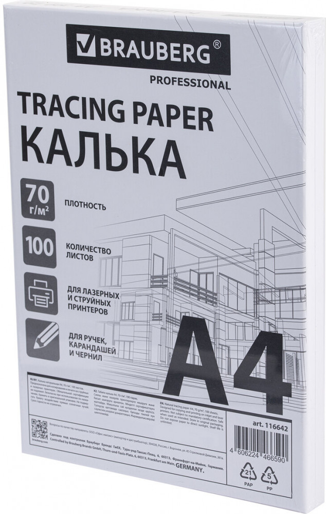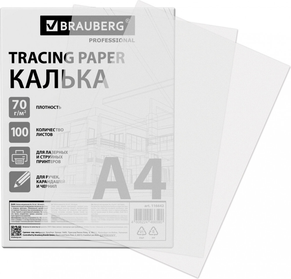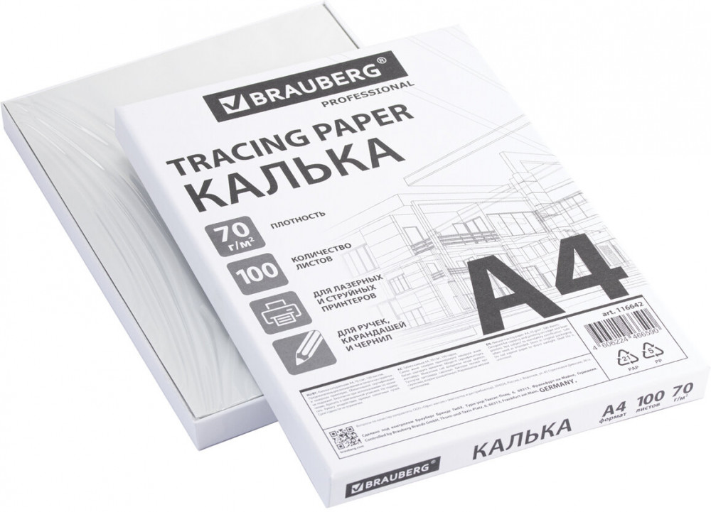 В данный момент этот товар отсутствует в продаже. Возможно, у нас найдется аналогичный или похожий товар здесь. Калька в листах Brauberg предназначена для широкого круга задач, в том числе для профессионального использования. Подходит для печати на струйном и лазерном принтере, а также для рисования и черчения карандашами, ручками и чернилами. Калька формата А4 изготавливается из высококачественного натурального сырья, обладает высокой прочностью, но при этом почти прозрачна, что позволяет легко копировать изображения. Плотность – 70 г/м2.