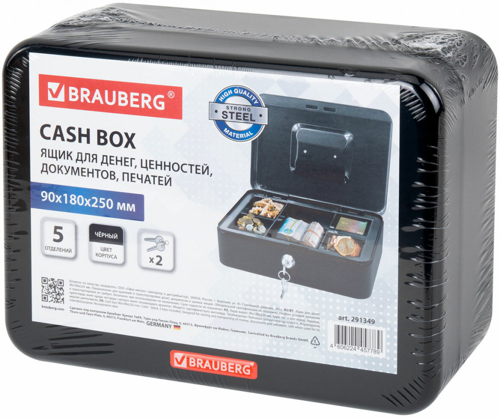 💳 Оплатить за товар можно при получении 🇰🇿 Есть бесплатная доставка по Казахстану от 1 дня 🎁 Копите бонусы с каждой покупки Ящик Brauberg предназначен для хранения и транспортировки денег, документов, ценных вещей и медикаментов. Защищает содержимое от постороннего доступа дома или в офисе. Отличное сочетание надёжности и вместительности. Съёмный лоток из ударопрочного пластика с 5 отделениями. Подходит для хранения денег, карточек, ключей и печатей. Под лотком предусмотрено пространство для документов и бумаг. Изготовлен из стали. Надёжный корпус с удобной ручкой выполнен в черном цвете. Оснащён ключевым замком, в комплекте — 2 ключа. Размер — 90×180×250 мм. Приобретайте ящик Brauberg — с ним ваши деньги, ценности и документы будут под надёжной защитой! |