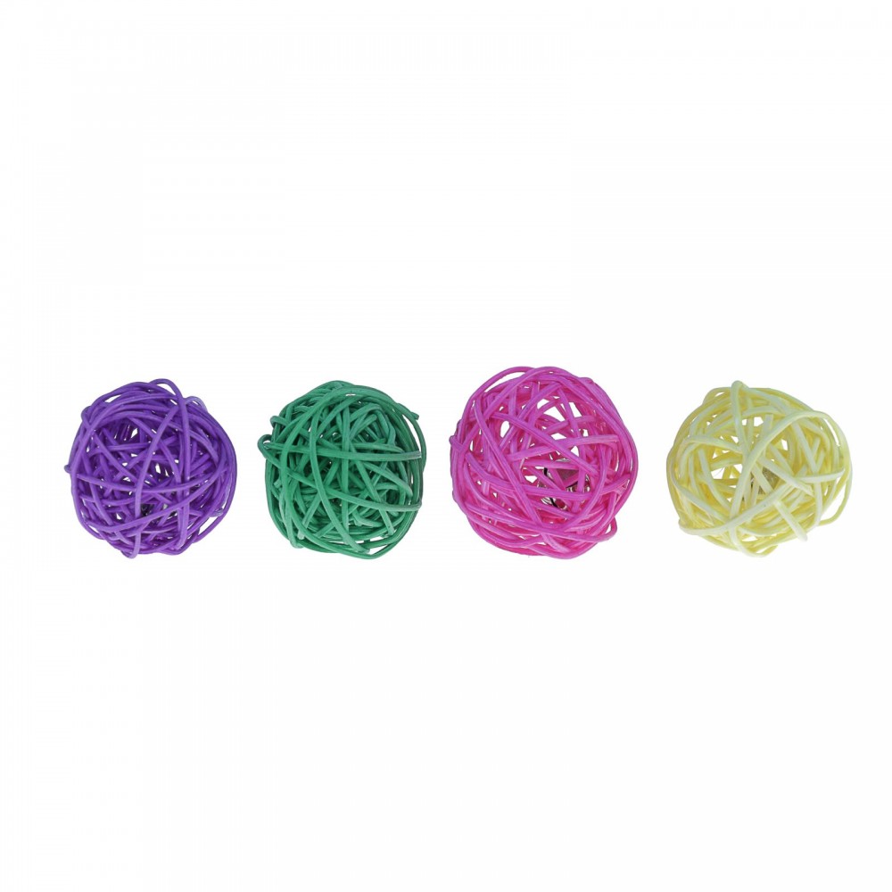 В наборе мячики двух разных цветов и размеров. Очень легкие, форму держат, лоза прокрашена хорошо, безопасные, не деформируются. Колокольчик внутри приятный на слух, ночью не мешает.