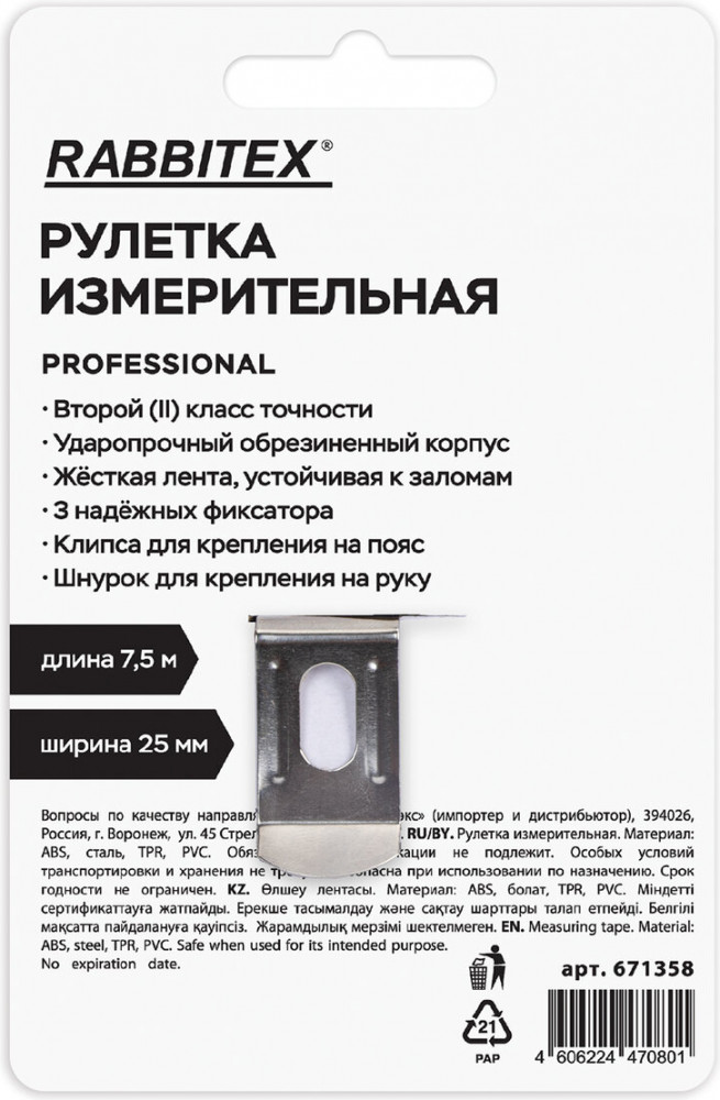 💳 Оплатить за товар можно при получении 🇰🇿 Есть бесплатная доставка по Казахстану от 1 дня 🎁 Копите бонусы с каждой покупки Рулетка RABBITEX применяется для измерения размеров поверхностей и расстояний. Благодаря эргономичному дизайну и высокому классу точности измерений рулетка станет незаменимым помощником в быту и профессиональной деятельности. |