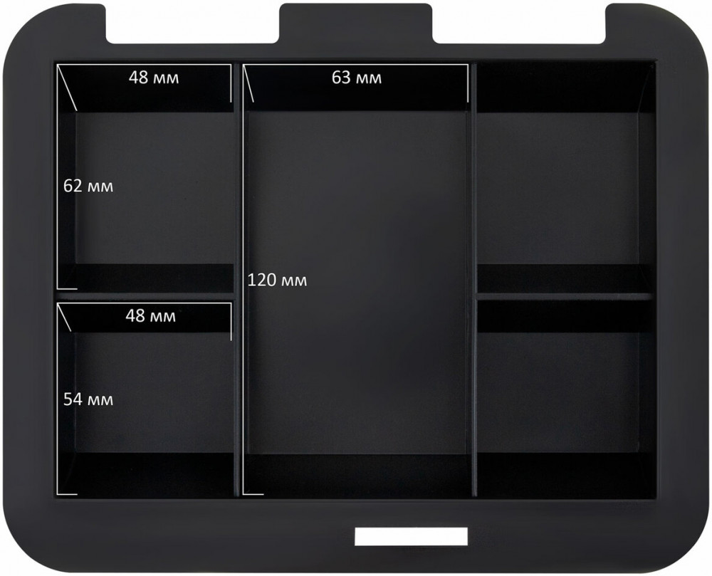 Съёмный лоток из ударопрочного пластика с 5 отделениями. Подходит для хранения денег, карточек, ключей и печатей. Под лотком предусмотрено пространство для документов и бумаг.