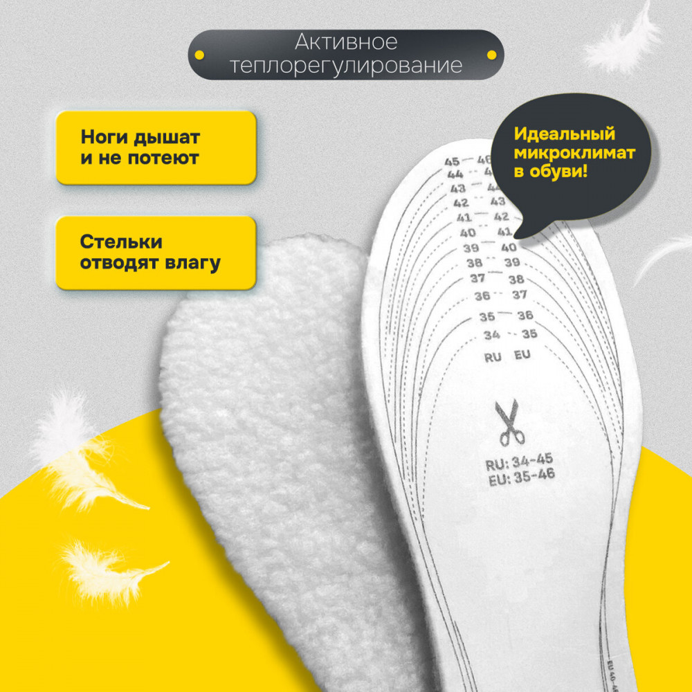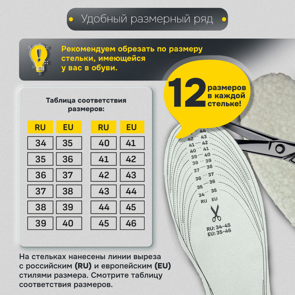💳 Оплатить за товар можно при получении 🇰🇿 Есть бесплатная доставка по Казахстану от 1 дня 🎁 Копите бонусы с каждой покупки Стельки зимние Shegra отлично подойдут для любой обуви, обеспечат комфорт при ходьбе и оптимальный микроклимат. Стельки для обуви с российским размером RU 34-45, что соответствует европейскому размеру EU 35-46. На стельках указаны оба стандарта размера: RU и EU, а также нанесены линии выреза. Для удобства на упаковке приведена таблица соответствия размеров RU/EU. |