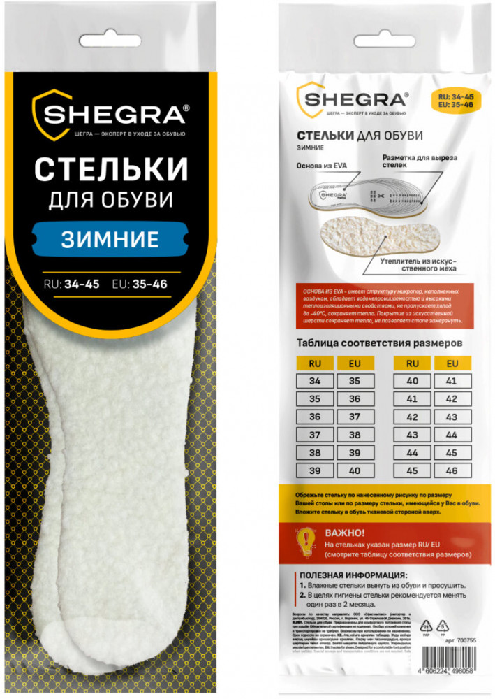 Shegra Стельки для обуви зимние-20% +6