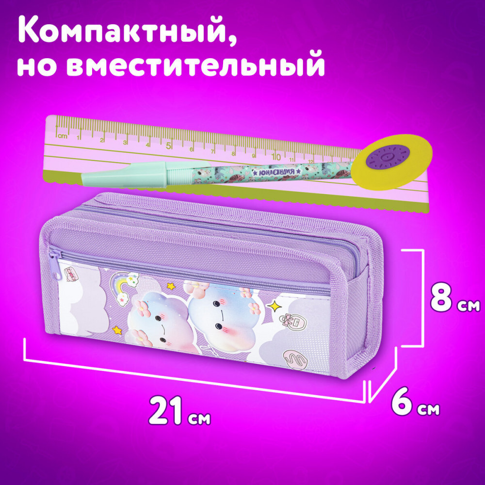 Юнландия ПеналВ данный момент этот товар отсутствует в продаже. Возможно, у нас найдется аналогичный или похожий товар здесь. Серия: Юниор Пенал Юнландия Юниор с двумя отделениями предназначен для хранения школьных канцелярских принадлежностей. Застегивается на молнию с металлическим бегунком. Вмещает до 50 предметов. Выполнен из прочного полиэстера, приятного на ощупь. Внутри пенала — одно отделение с застежкой-молнией, оснащенной металлическим бегунком. Снаружи дополнительное отделение — карман с застежкой на молнии. Яркая печать уникального дизайна на переднем кармашке пенала. Компактный размер 21×8×6 см делает пенал удобным для ежедневного использования. Идеально подходит для хранения ручек, карандашей, ластиков и других канцелярских принадлежностей. Упакован в прозрачный полиэтиленовый пакет с европодвесом, который сохранит качество и товарный вид при хранении и транспортировке. |