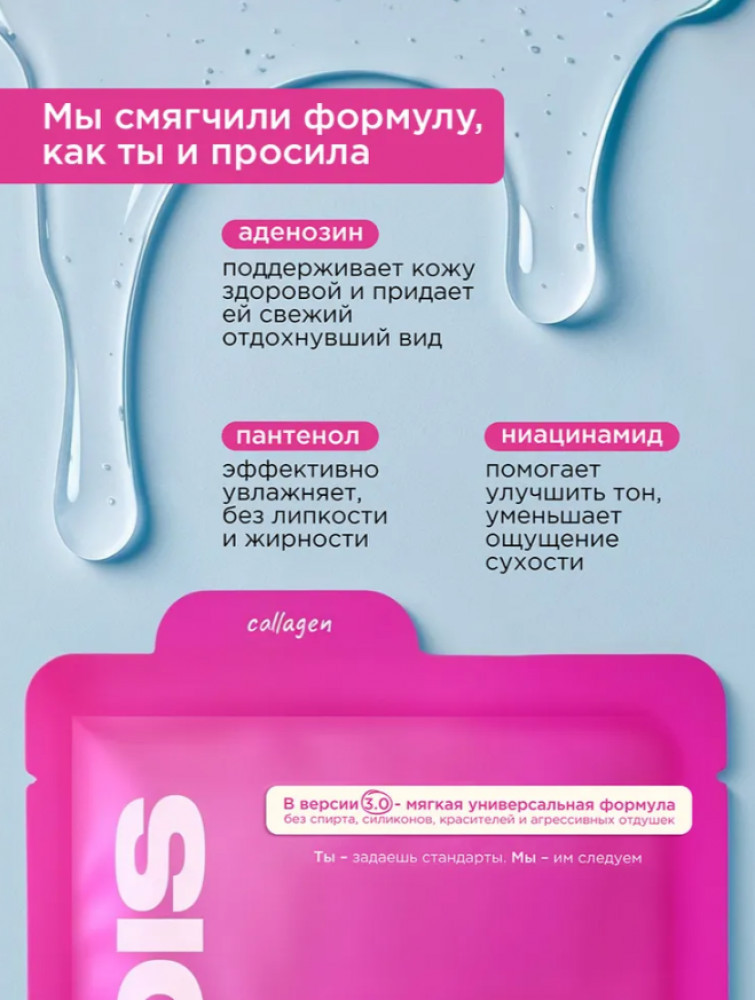Коллаген: aqua, glycerin, hydrolyzed collagen, propylene glycol, trehalose, panthenol, niacinamide, carbomer, arginine, hydroxyethylcellulose, 1,2-hexanediol, dipeptide-2, soluble collagen, peg-50 hydrogenated castor oil, fragrance, chamomilla recutita (matricaria) flower extract, sodium hyaluronate, paeonia albiflora root extract, malva sylvestris (mallow) flower extract, taraxacum officinale (dandelion) rhizome/root extract, lonicera caprifolium (honeysuckle) flower extract, euglena gracilis polysaccharide, viola yedoensis extract, aloe barbadensis leaf juice, phenoxyethanol.
