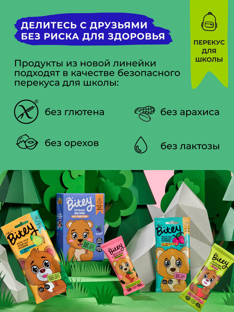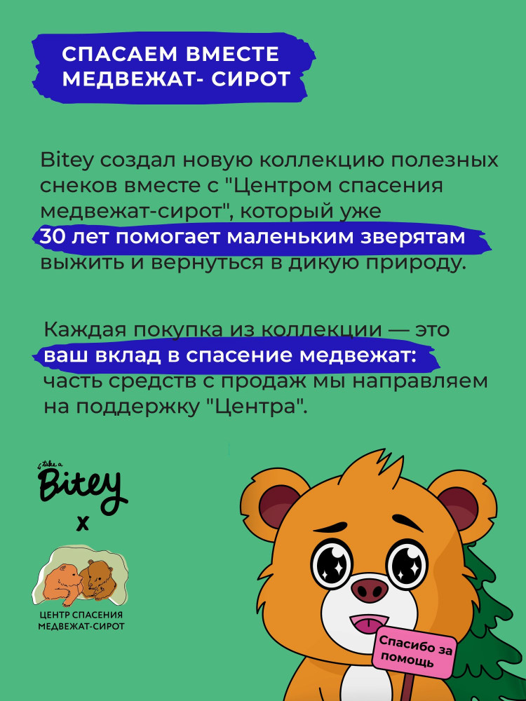 Мы в Bitey объединились с «Центром спасения медвежат-сирот» и создали коллекцию пастилы без добавления сахара, чтобы поддержать деятельность центра. Теперь дети смогут перекусить без риска для здоровья, а медвежата получат поддержку и шанс выжить, чтобы вернуться в родной лес! Мы проводим исследования и разрабатываем полезные продукты для взрослых и детей в нашей собственной лаборатории в России. Наша фабрика соответствует стандартам HACCP (ISO22000), FSSC и международным сертификатам качества, что гарантирует высокую степень надежности и безопасности продукции.