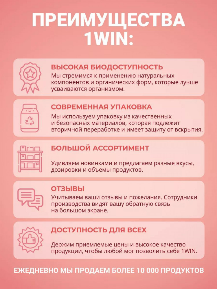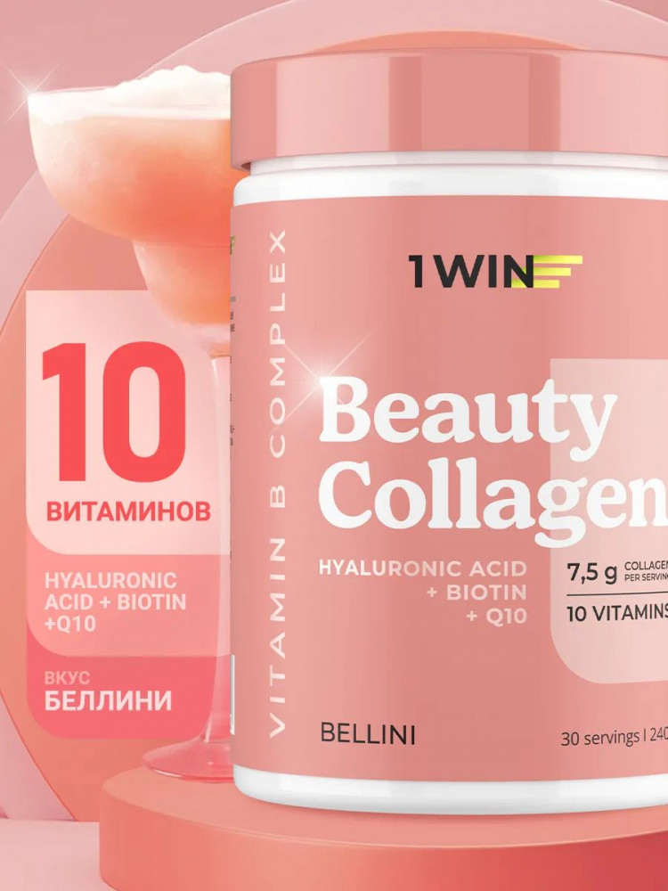 Beauty Collagen от 1WIN с гиалуроновой кислотой, биотином и коэнзимом Q10 — усиленная формула красоты и естественной молодости. Добавка содержит пептиды говяжьего коллагена, полученные в процессе гидролиза кислотами. Это форма наиболее биодоступна — быстро и легко усваивается, ускоряет проявление результата. Комплекс обогащен витаминами — C, E, группы B.