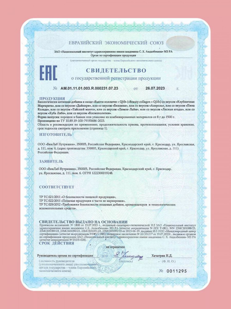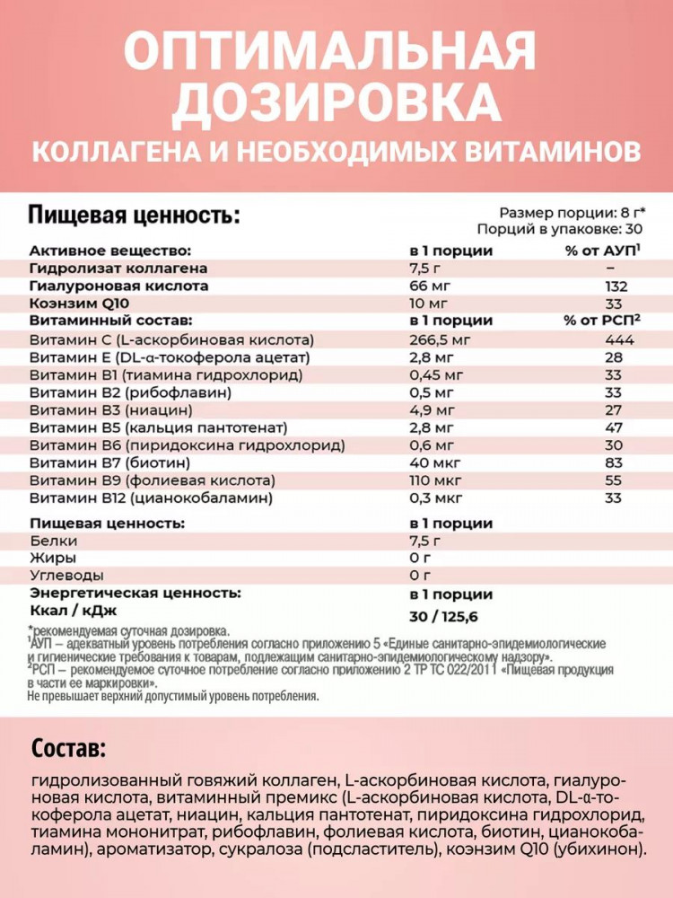 Гидролизат коллагена (7,5 граммов в 1 порции) подтягивает кожу, повышает ее эластичность и упругость, устраняет небольшие неровности и мелкие морщины. Коллаген укрепляет волосы и ногти, поддерживает здоровье суставов и связок. Гиалуроновая кислота поддерживает водный баланс клеток организма, увлажняет кожу, предупреждает потерю влаги.