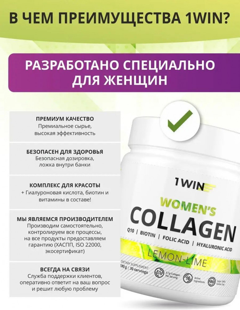 Коллаген для женщин со вкусом лимона и лайма от 1WIN — это новинка, не имеющая аналогов. Комплекс разработан специально для женщин, желающих сохранить здоровую кожу, волосы, ногти, а также улучшить их внешний вид.