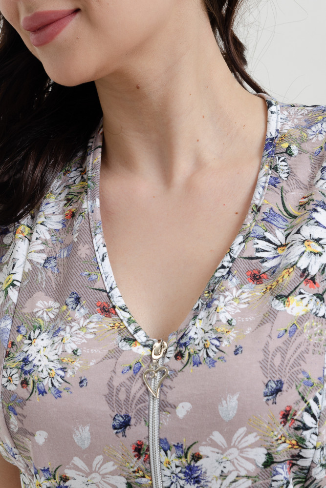 Халат женский нежной расцветки с ромашками выполнен из кулирки 100% хлопок. Халат укороченный, без рукава, на молнии, под карманом подрез, который придает изделию расклешение. Халат очень комфортный, отлично подойдет для дома и отдыха.