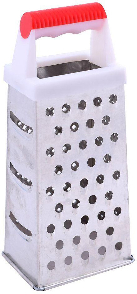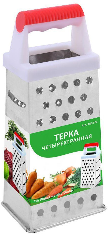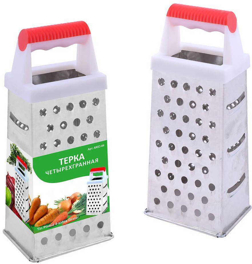 Четырехгранная терка — удобное кухонное приспособление с отверстиями и насечками четырех типов. По двум сторонам расположены крупная и мелкая терки для моркови, лука, яиц, картофеля. Мелкие острые отверстия нужны для получения цедры. Сторона с тремя крупными отверстиями предназначена для нарезки тонких ломтиков овощей или фруктов. |