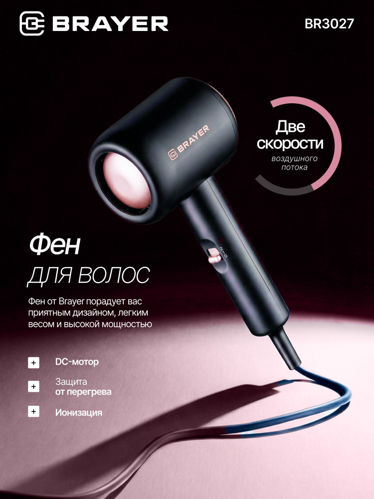 Забудьте о громоздких и перегревающихся фенах! Brayer BR3027 — это новый взгляд на ежедневный уход за волосами. Благодаря мощному DC-мотору и продуманной конструкции он быстро и бережно сушит волосы, сохраняя их здоровье и естественный блеск. Компактный, легкий и невероятно удобный — он станет вашим верным помощником в создании идеального образа каждое утро.