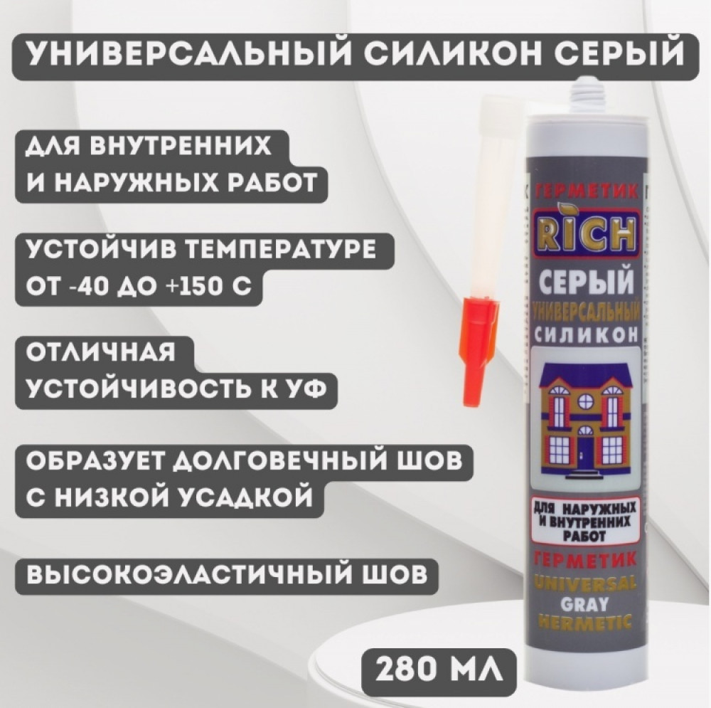 Rich Герметик универсальный силиконовыйВ данный момент этот товар отсутствует в продаже. Возможно, у нас найдется аналогичный или похожий товар здесь. Высококачественный кислотный силиконовый герметик предназначен для строительных и общих ремонтных работ: кухни и ванные, вентиляционные системы, морозильные камеры, остекление. Обладает отличной адгезией к большинству строительных материалов: стекло, металл, керамика, древесина, различные виды пластиков. Особенно хорошо подходит для герметизации швов вокруг дверных коробок и оконных рам, для защиты полиуретановой пены от УФ-лучей, уплотнения деформационных соединений и стыков, герметизации витрин стендов, панелей, проводов кабельных каналов и других работ. Затвердевший герметик устойчив к воздействию химических растворов, а также к различным атмосферным явлениям: дождь, снег, экстремальные температуры, УФ-лучи, морская вода. |